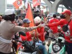 Jakarta – Polwan dari Polres Tanjung Priok menunjukkan aksi humanisnya saat melakukan pengamanan aksi Hari Buruh Internasional. Para massa aksi diberi air