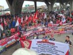 Bekasi – Ribuan massa Buruh Konfederasi Serikat Pekerja Indonesia (KSPI) dan Konfederasi Serikat Pekerja Seluruh Indonesia Andi Gani Nena Wea (KSPSI AGN),